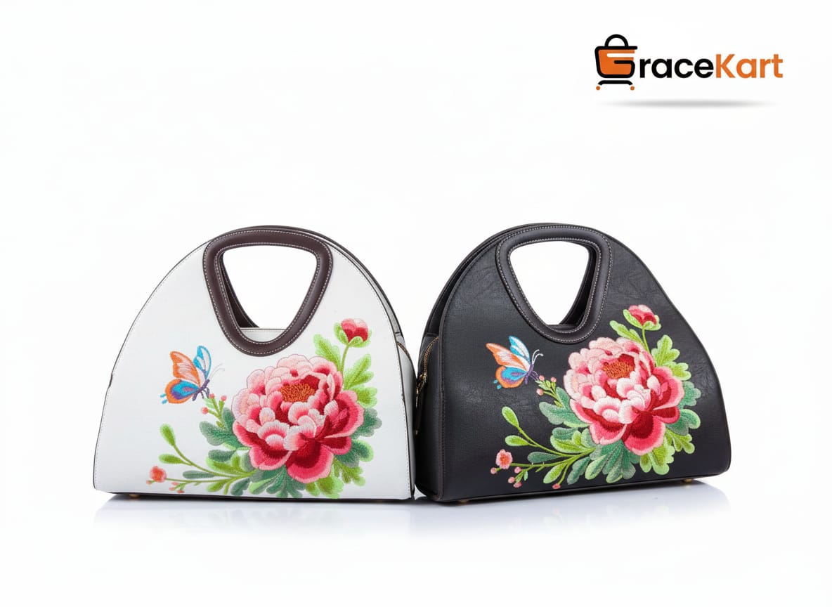 A stunning handcrafted handbag featuring rich peony embroidery and vibrant butterfly detailing. Designed with a unique arc silhouette and comfortable grip handles, this bag blends traditional artistry with modern elegance. Perfect for festive occasions, weddings, or daily luxury styling.